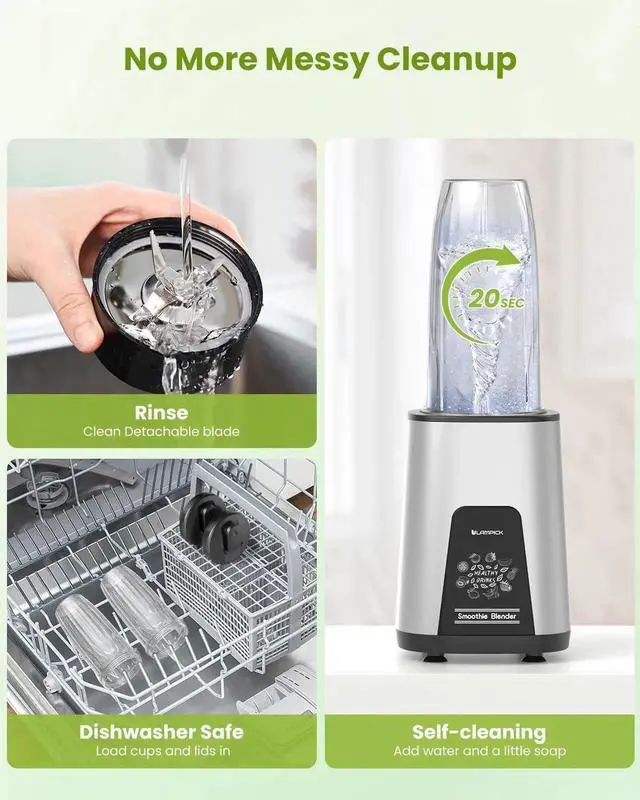 UPGRADED EXPERIENCE: blender comes with a food grade 304 stainless steel 6-leaf gear blade, allows you to blend and extract nutrients easily. It's detachable design makes cleaning quick and hassle-free, saving you time and effort.