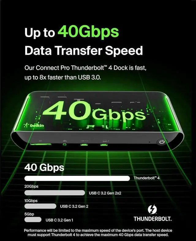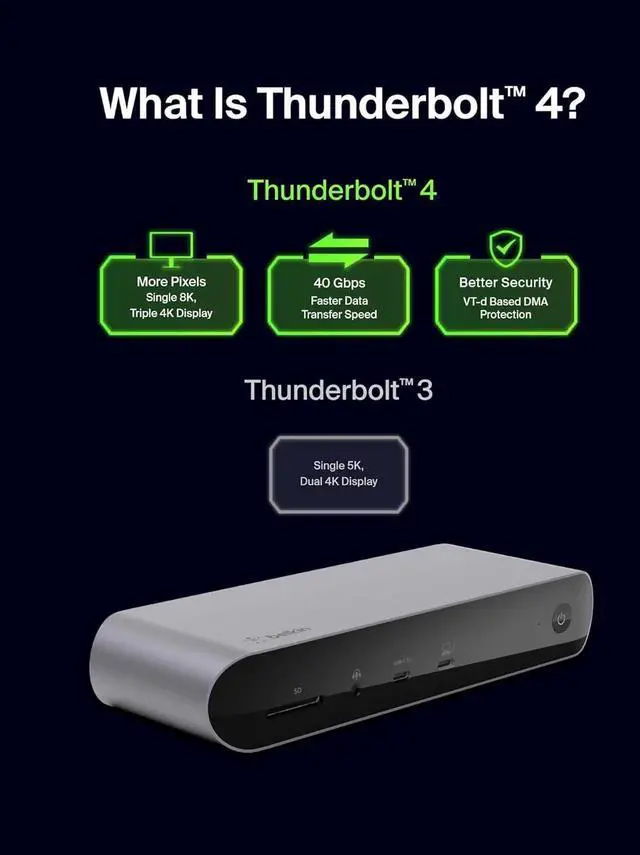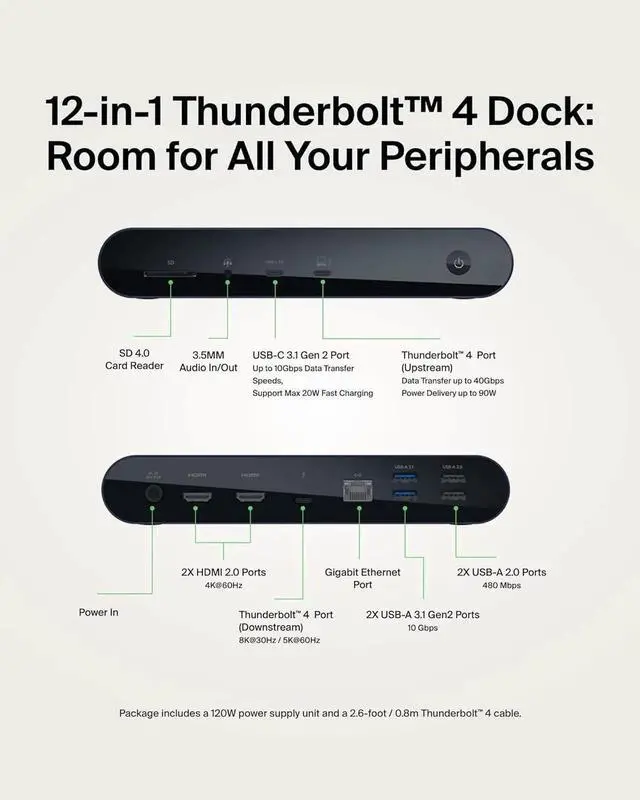 Cater to all your connectivity needs with the Thunderbolt 4. The ultimate docking solution for your Mac or Windows laptop, it has 12 ports to connect your MacBook or Windows laptop to multiple devices, video, ethernet, and power through a single Thunderbolt 4 cable enough to receive recognition from entities such as The Verge and Forbes. Get up to 40Gbps data transfer speedsthats 8x faster than USB 3.0. Charge your laptop and other connected devices simultaneously with up to 90W of Power Delivery. Immerse yourself in a smoother and clearer visual experience with top-tier video resolutions on as many as three additional displays. Included Thunderbolt 4 cable is compatible with Thunderbolt 3, USB-C, and USB4.