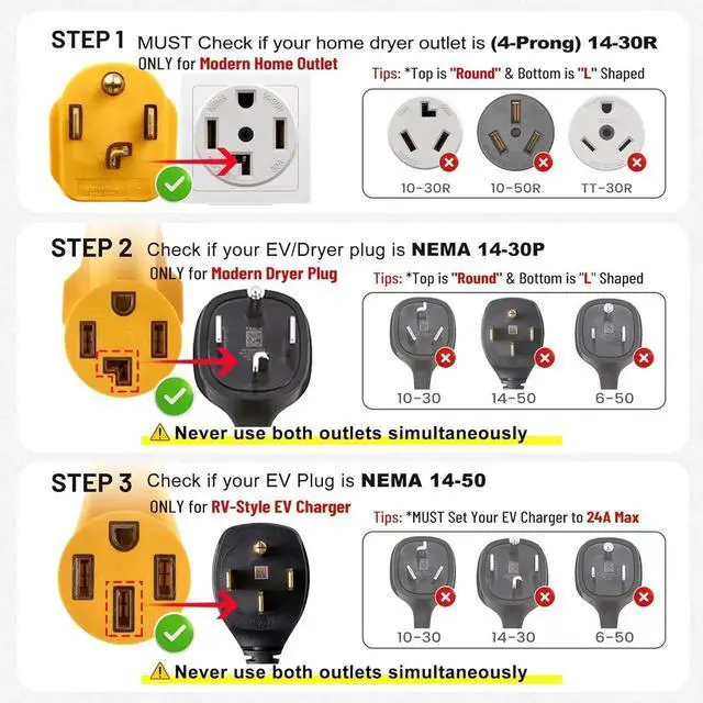 Flexible Power Solution: Integrates power either a NEMA 14-30R (for 4 prong new dryers) or NEMA 14-50R (for RVs, EVs) from a single, modern 240-volt outlet; It offers a convenient and cost-effective switching solution