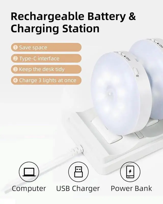 Charging Station: Built-in 1000mAh batteries deliver up to 8 hours at 100% in Always-On or 1545 days in Auto Mode (typical use). The included 3-in-1 charging station recharges three puck lights at once from a single outletCleaner counters, fewer plugs, no battery swaps. Plus, it can charge other devices (phone, earbuds, headlamp, mini fan) adding extra convenience.