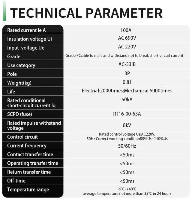 220V over-voltage and under-voltage protection: Designed for home track installation, dedicated to PZ30 distribution box. This series of automatic transfer switches is suitable for 50/60Hz dual power grid. The working current is 100A. 220V/50Hz
