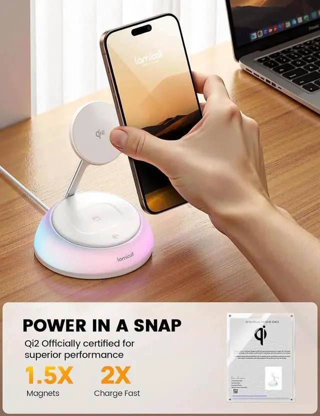 Safe and Fast Charging - Equipped with an intelligent chip, our Qi2 wieslss charger for MagSafe provides comprehensive safety features, including FOD alerts, over-current, over-voltage, and over-temperature protection. Combined with a non-slip silicone base, your devices stay securely in place and protected throughout the charging process, ensuring it's a reliable and stable accessory for any desk or nightstand.