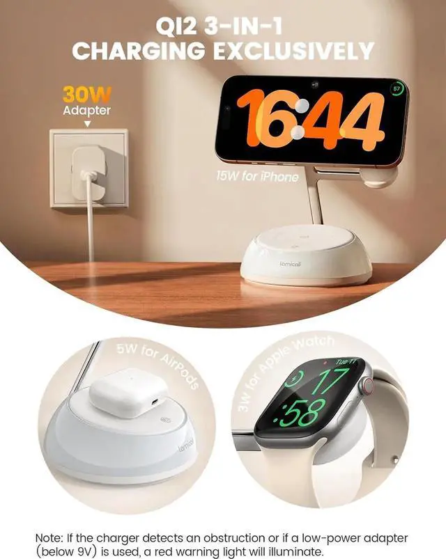 Note: The charger features a smart safety alert system. If this Qi2 charger for Magsafe detects an obstruction or if a low-power adapter (below 9V) is used, a red warning light will illuminate to ensure safe and efficient charging.