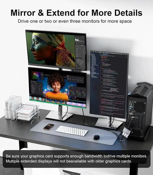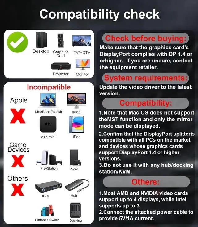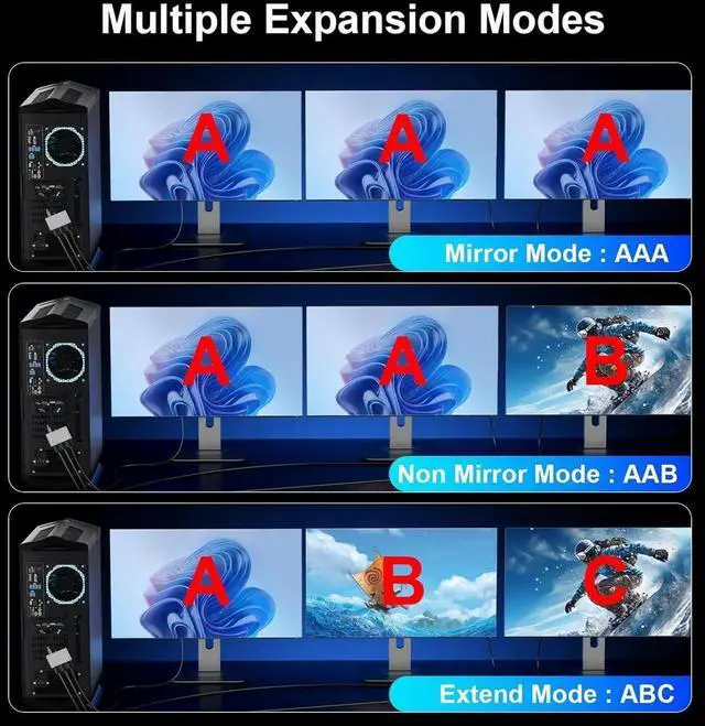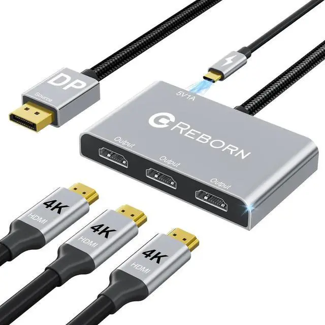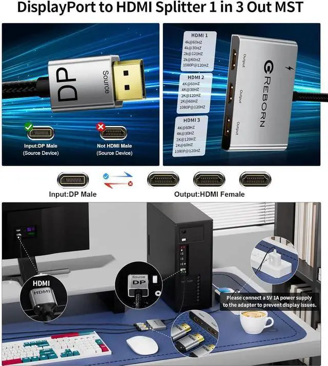 Here's how: Plug the DP connector into your signal source like a PC or graphics card. Then, connect the provided power cable to get 5V/1A current. Finally, use HDMI extension cables that support 4K@60Hz to link the 3 HDMI female connectors to your monitors. *Note: PCs with integrated GPUs usually only support mirroring mode or can only extend one monitor