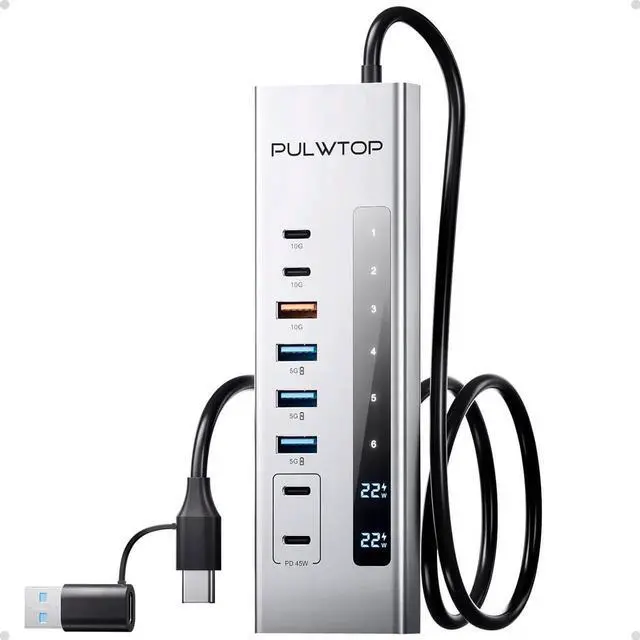 Faster Transfer SpeedUSB C Powered Hub with 2*USB-C ports, provide file transfer at speeds up to 10Gbps, and 1*USB-A 3.2 10Gbps, 3 *USB-A 3.0 ports provide file transfer at speeds up to 5Gbps. HD photos, videos and any file transfer can be done in seconds. The USB C hub provides you with fast file transfer from different devices and can meet your multiple needs.