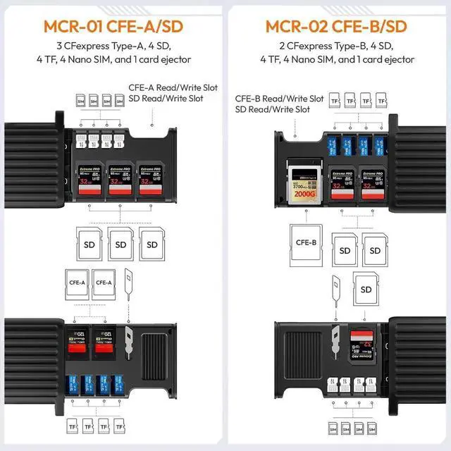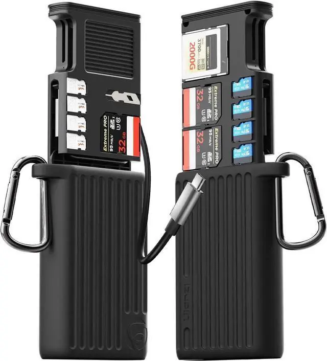 IP54 Dust & Splash Resistance Features an IP54-rated protective case, perfect for various environments. The pull-out sealed design prevents accidental openings and keeps cards safe. Includes a carabiner for easy attachment to bags, ideal for travel.