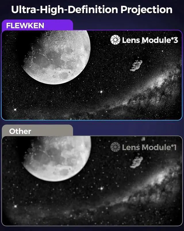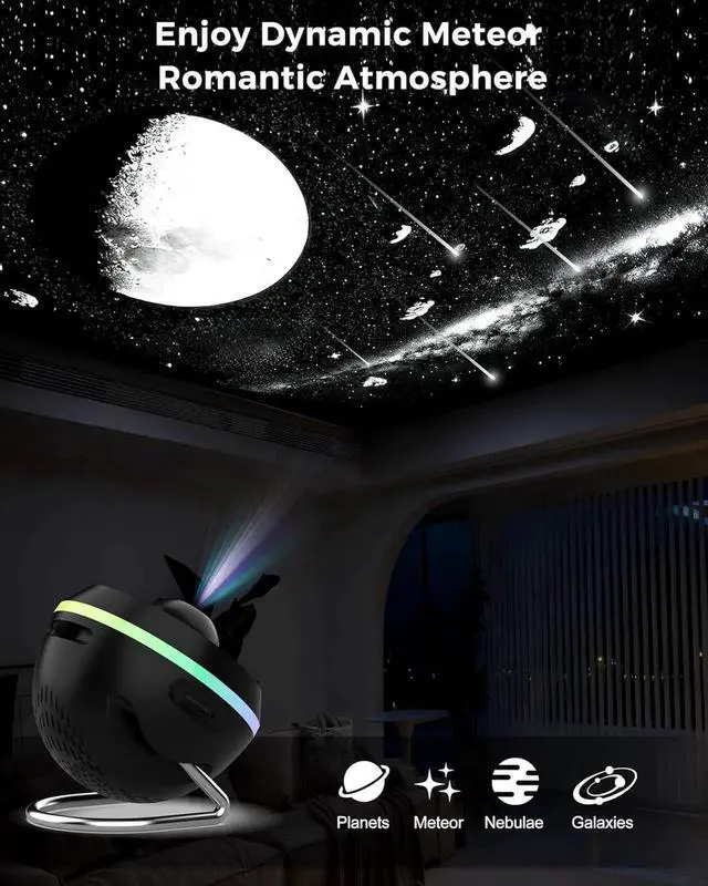 DYNAMIC METEOR SHOWER & RGB LIGHT STRIPThis galaxy projector is equipped with a unique light strip design and dynamic meteor function. offe 4 colorful gradient lighting effects and warm and cold light options, plus 2 realistic meteor effects to simulate meteors crossing the sky. It ensures a realistic night sky experience, making it an ideal galaxy star projector for those seeking a fantastical journey.