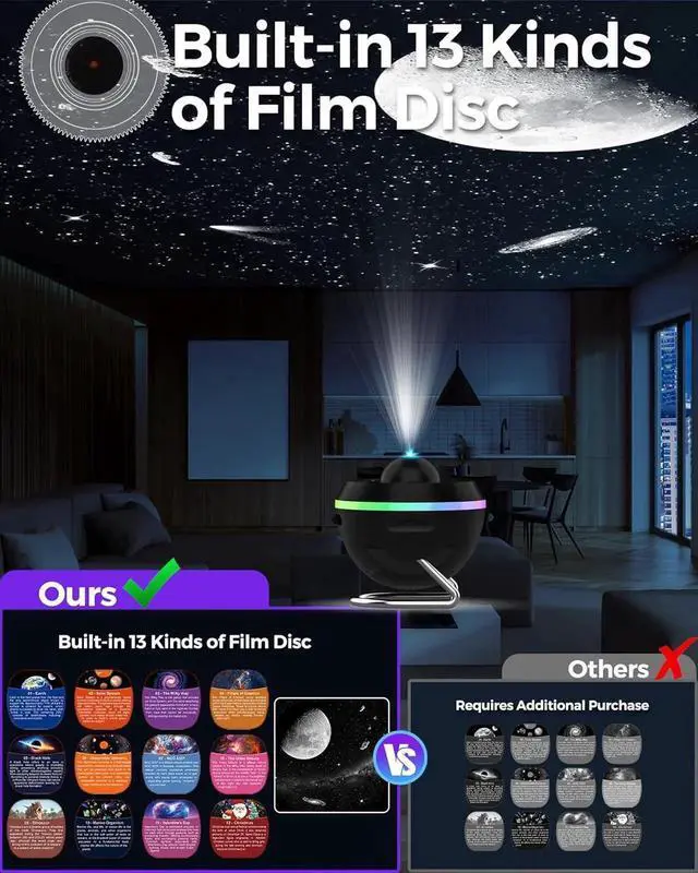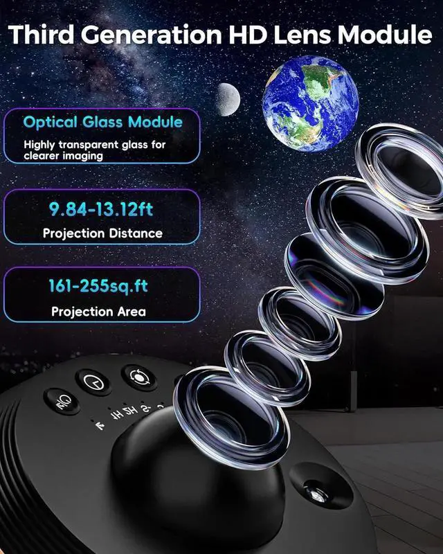 MULTI-FUNCTIONAL & EASY TO CONTROLThis space projector features easy one-touch controls and indicator lights that let you switch power or meteor effects, set 1-hour or 2-hour auto-off timers, adjust ambient light modes, and choose between slow (13-minute) or fast (6-minute) silent rotation. The advanced motor simulates natural celestial movement with noise lls below 30 dB, creating a calming atmosphere that relis stress, promotes relaxation, and improves sleep quality. Perfect for use as a night light, ceiling projector, or ambient home decor.