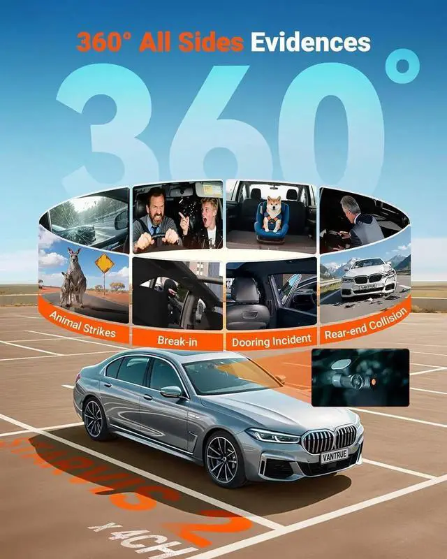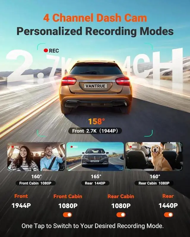 [ 4 Channel 360° Full Coverage ] Experience complete 360° protection with our advanced 4 channel dash cam, eliminating blind spots on the road and inside your vehicle. Featuring a powerful dual-core processor, this dashcam records in stunning 2.7K +1080P+1080P+1440P resolution, with flexible recording modes (1CH/2CH/3CH/4CH) to adapt to any driving scenario. From daily commutes to long road trips, this all-in-one surveillance solution provides effortless driving safety and legal protection.