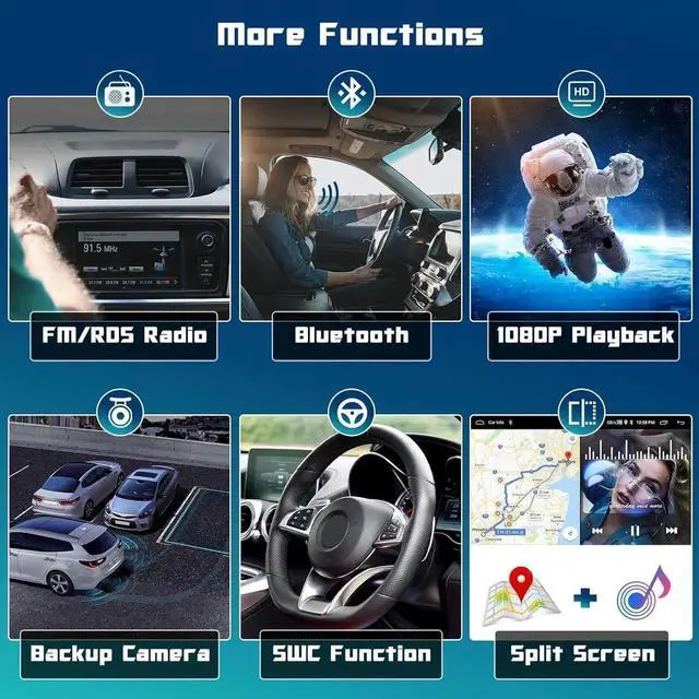 - Backup Camera/Bluetooth/FM RDS: Carplay car stereo will come with a 170 degree night verson backup camera. When properly connected, it will automatically display a rear view image when you reverse, providing parking assistance. Android car stereo supports bluetooth hands free calls, wireless BT music. High quality FM radio with RDS, support preset 18 stations, music, traffic info, weather forecast etc