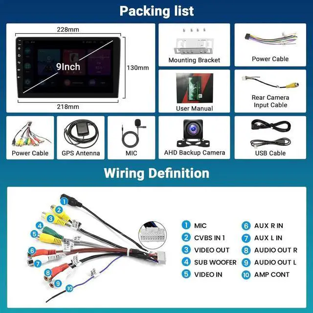 Will You Get: Android 13 head unit, Night vision backup camera, External microphone, GPS antenna, Power harness, USB adapter x 2, RCA input and output wire, Cam-in Wire, Installation bracket x 2, User manual. Any question of installation, wiring or operation, please find our help soon-