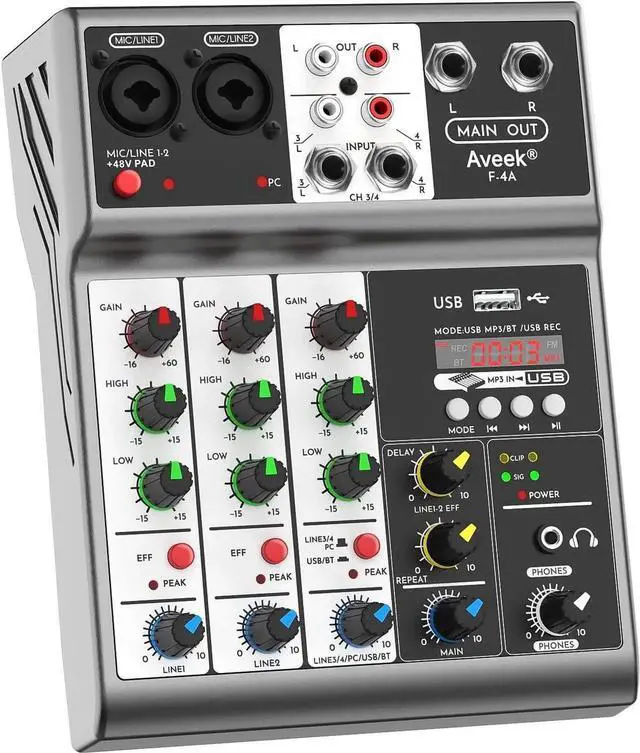 - 2-band EQ/gain controls/Echo and Delay EffectHighly accurate LED Peak Level Indicator. easily adjust the high and low frequencies of each channel with the onboard 2-band EQ and gain controls. You can even add delay or Echo effects in your mix. Suitable for computer music recording, live streaming, podcasting, small bands show, network anchoring, ZOOM meetings, wedding etc.