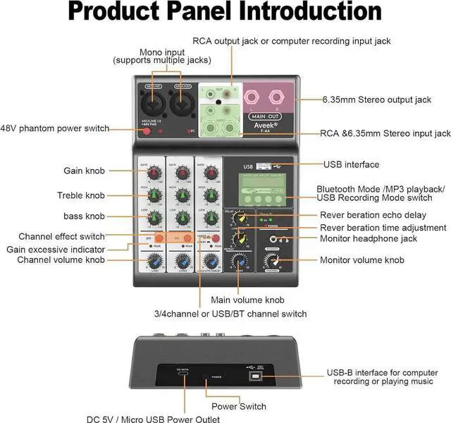 Bluetooth Wireless Connectionthis DJ audio mixer enable to wirelessly stream music from Pad, Phone, Tablets, Computer and more bluetooth device to mix music. It has built-in control like Play/Pause/switch songs and Modes. Bluetooth works within 1.5 ft. false48V Phantom PowerThe sound mixer have 2 XLR inputs with phantom power. you can feel free to switch 48V phantom power and ultra-low noise distortion enables the audio mixer to be used with condenser microphone. false- 4 Channels Input Mixer The Mini Mixing Console is great for multiple devices connectivity. 2 XLR Lines input jack to connect mics or guitar, 1 pair L/R 6.35 mm and 1 pair L/R RCA stereo inputs to connect CD plays/keyboard/computer.