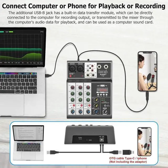 - USB-B Interface for PC/Phone Recording or Playing AudioThe USB-B jack has a built-in sound card recording transmission processor, so this audio mixer can connect the computer pc, mobile phone, tablets or external USB device to mix and record or play music, Notice: need a USB To Phone OTG Adapter to connect your phone, Because only the OTG Adapter can do data transfer.