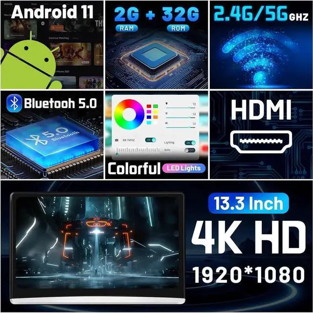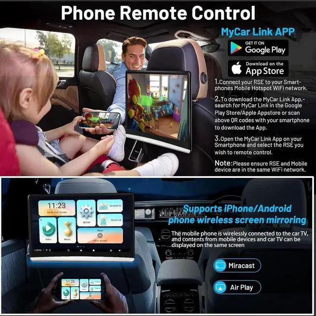 Dual Speakers & 5.0 BluetoothBuilt-in stereo surround speakers allow you to immerse yourself in the atmosphere of listening to music or watching movies while driving in the car, and more stereo surround sound will be played when watching videos with headphones. With Bluetooth, you can connect your speakers or headphones wirelessly at any time. If there is no sound when playing the headrest car TV, please turn off FM and Bluetooth to tryWireless Phone Connectivity This video car TV supports iOS AirPlay and Android Miracast phone screen mirroring. It turns your phone into a smart remote control for remote control of your car video monitor via the MyCar Link app.