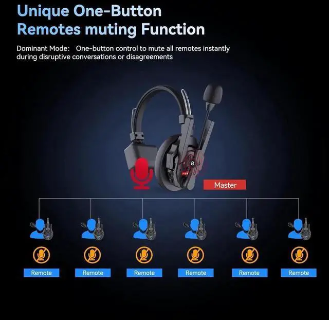 Extra Long Talking DistanceDelivers a range of R500m/1, 640ft (LOS), and Ø1000m/3, 280ft (LOS) while both remotes are connected to the master. falseAI noise reductionThe advanced 2.0 AI AEC technology eliminates echoes, reverberation, and unwanted ambient noise. falseOne-Button Clarity design allows you to activate the noise cancellation feature at the press of a button. false- No host setupYou can connect any headset to form a group of 1-13 people. Or set Masters for grouping multiple groups.