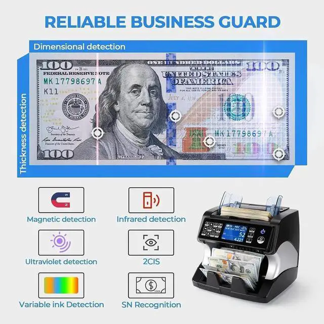 Business Guard: The mixed denomination curren counter has 11 counterfeit detection methods to ensure your bills authenticity. Cash counter mixed denomination saves your effort and keeps you peace of mind when you deal with heavy cash counting work. 2CIS, UV, MG, IR, MT, and SN Recognition, effective against Superdollar.