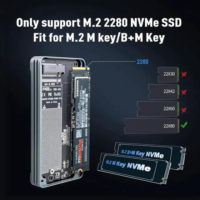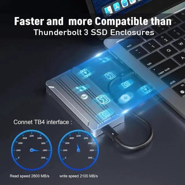 - [Superior Speed M. 2 Enclosure] This 40Gbps M. 2 NVMe SSD Enclosure Using Intel JHL7440 high-end main control chip, adopts dual-chip master control, support USB4 and fully compatible with Thunderbolt 3 USB 3.2 / 3.1 / 3.0 /Type-C (USB 2.0 and below not compatible)