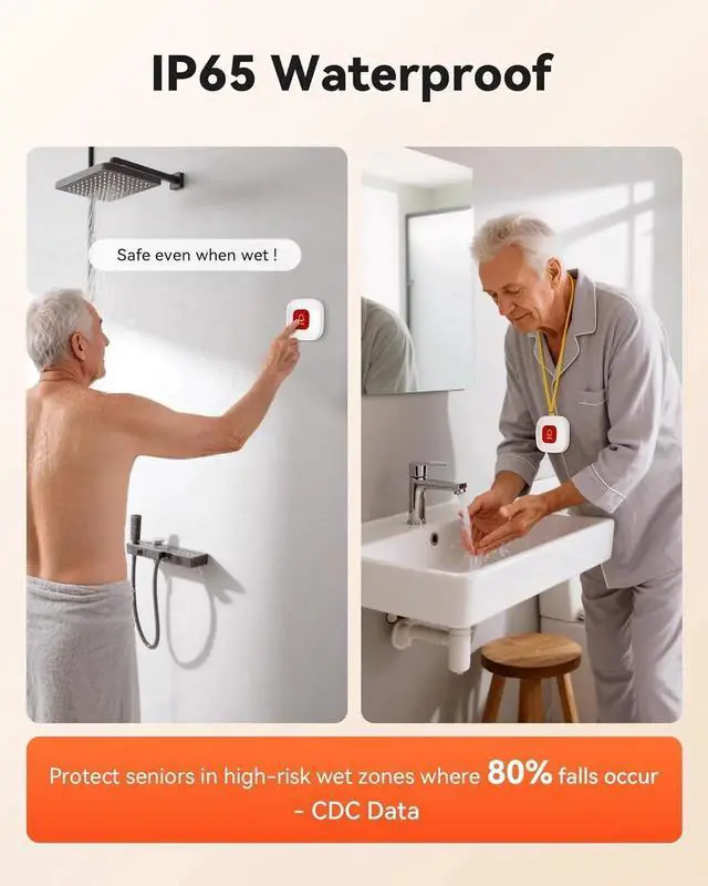 IP65 Waterproof Call Buttons: Neck-wear emergency alert buttons safely in showers. Wall buttons withstand spills/humidity. Protect seniors in high-risk wet zones where 80% falls occur