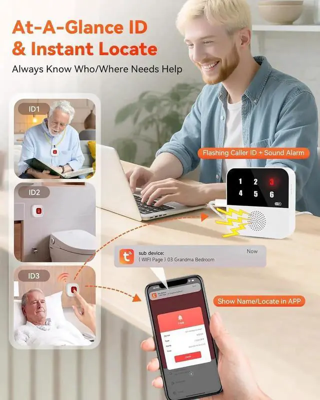 At-A-Glance ID & Instant LocatePress button Hub flashes call ID/alarm, APP shows Name/locate