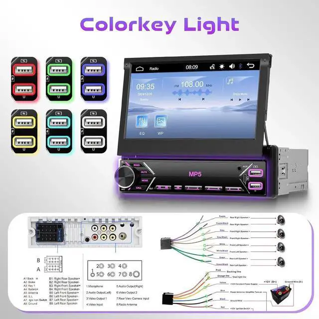 Compact 1 Din Design & Color Backlight: With its compact 1Din Retractable design and installation dimensions of 178*50 mm (7*2 inch), this radio fits perfectly into most vehicle dashboards, offering a sleek and space-saving solution for your in-car entertainment needs. Enhance your driving atmosphere with customizable color backlight settings, allowing you to choose from a range of colors to match your mood and style
