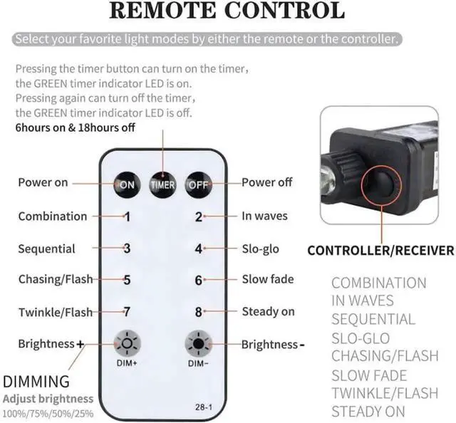 Timer Function: Once activated, the lights will automatically stay 6 rs on and 18 rs off.