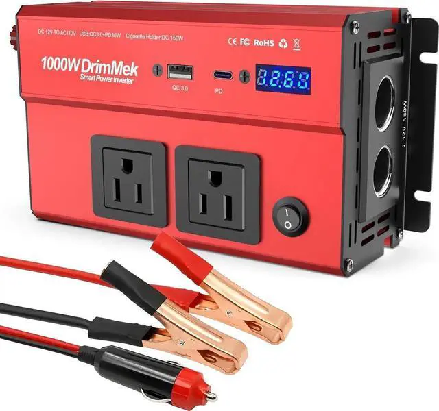 Packed Performance: DrimMek 1000w power inverter delivers a stable 1000W of continuous DC - to - AC power, car inverter 12V to 110V. With 2 110V AC outlets, a USB port featuring QC 3.0, PD, and 2.4A output, dual 12V Car cigarette lighter inverter and 2 spare 40A Fuses. The intelligent display can automatically detect car temperature, battery power, USB voltage, current