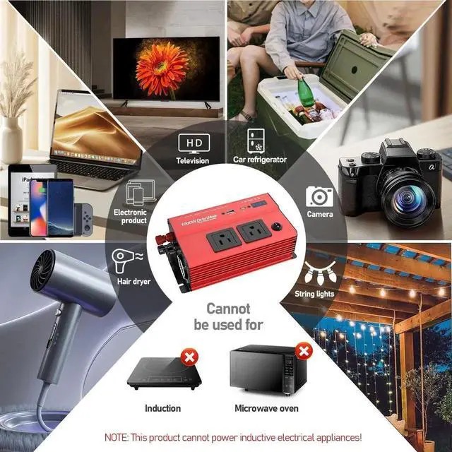 It is extremely portable and lightweight, weighing only 2.3 pounds. Camping and Outdoor ActivitiesIn the wild environment where there is no access to traditional power sources, the car inverter can be connected to the vehicle's cigarette lighter adapter. It is equipped with 4 output ports and can supply power to devices such as lights, fans, and small kitchen appliances. This 12V to 110V inverter is a must-have item for road trips or camping. - Power -