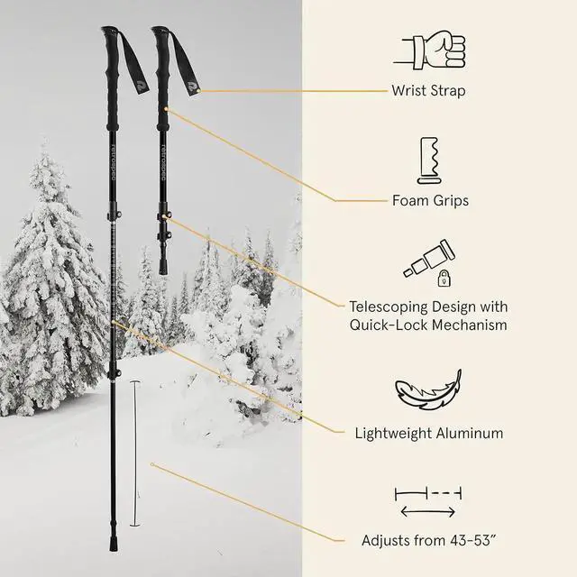 - STABILITY & CONTROL: Lightweight trekking poles for snow with terrain-specific attachments keep you balanced on any surface. Adjustable heights ensure a custom fit for your adventures
