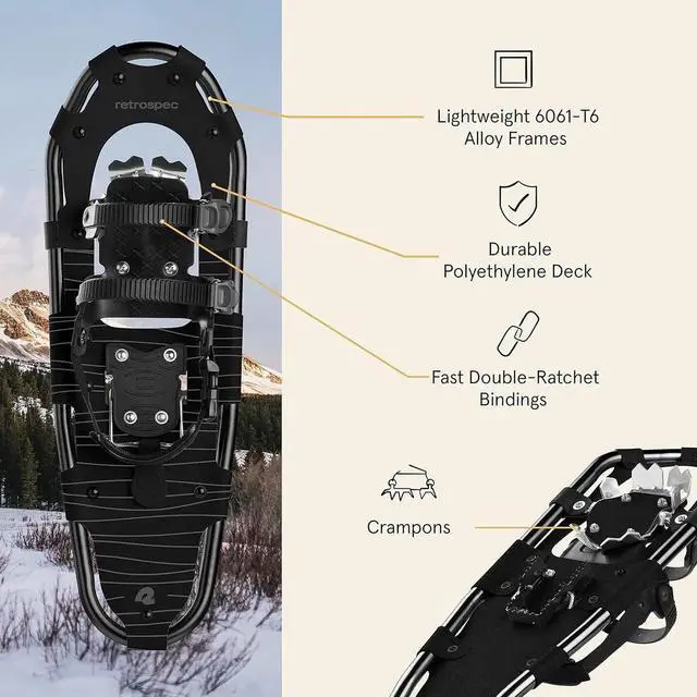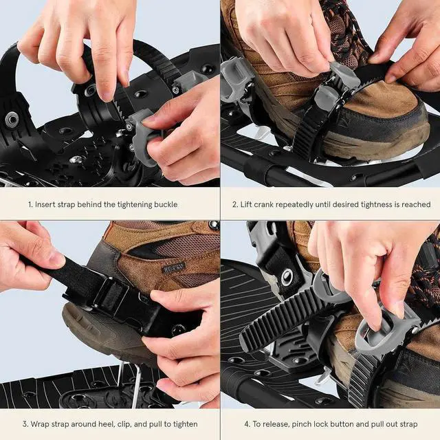 - QUICK-LOCK COMFORT: Secure double-ratchet bindings let you strap in and out effortlessly, even with gloved hands. No more fumbling with complicated straps when you're ready to start snowshoeing