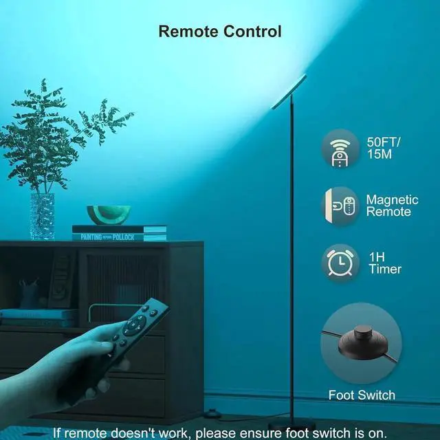 Dance VibesElevate your moves with dynamic lighting effects and vibrant hues Featuring dynamic RGB and single-color modes, our living room floor lamp supports smooth dimming from 10% to 100% and color temperature adjustments from 2700K to 6500K. The adjustable lamp head allows for precise lighting direction. The remote control allows you to effortlessly adjust the lighting without needing to approach the lamp, enhancing comfort and convenience. The foot switch eliminates the inconvenience of groping for the switch in the dark. The built-in timer function automatically turns off the dimmable corner floor lamp, saving energy and reducing waste.