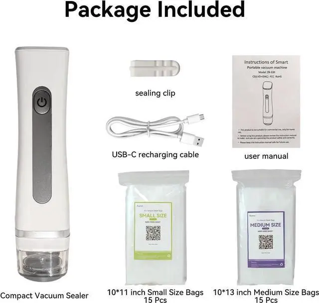The Package Includes: 1 x vacuum sealer, 30 x vacuum seal bags (10x11 inch Small Size, 10x13 inch Medium Size each for 15), 1 x user manual, 1 x USB-C cable, 1x sealing clip. We stand behind our product and offer 2-year warranty. Feel free to contact us if you have any question and need help