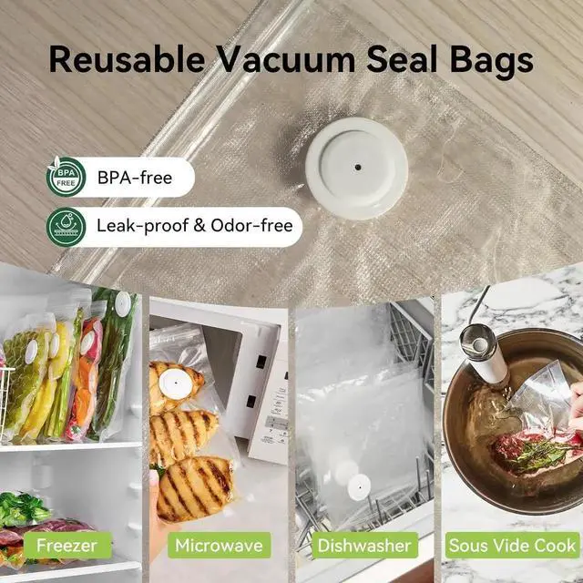 Reusable Zip Seal Freezer Bags: Formulated with BPA-free material, included vacuum sealer bags for food are washable and dishwasher safe, leaving a smaller carbon footprint than disposable plastic rolls and huge waste. Use the clip to help seal the bag. Extended Freshness with no spoilage worries