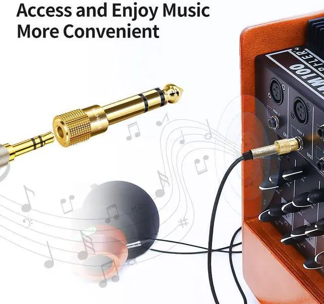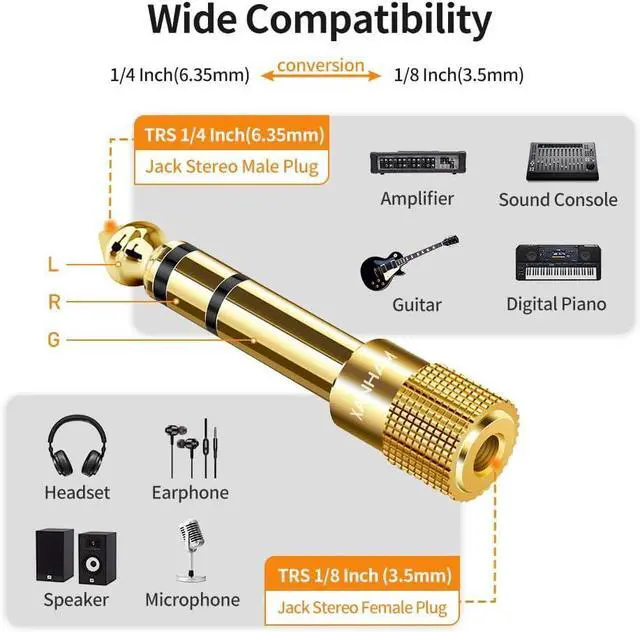 TRS Stereo Adapter: This adapter is with TRS stereo 1/4 6.35 mm male plug and TRS stereo 1/8 3.5 mm female plug which is allowed devices with 1/4 6.35 mm TRS stereo port to connect 1/8 3.5 mm TRS plug aux cable. Sold Copper with 24K