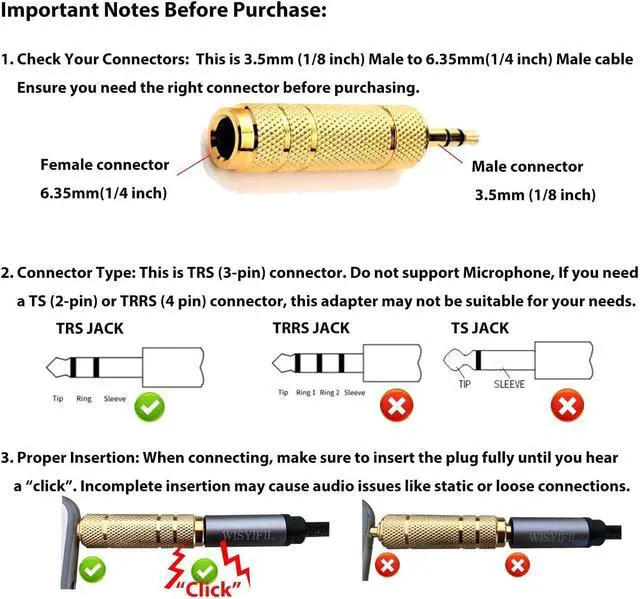 Important Compatibility Notice: This is a 3.5 mm TRS (3-pole) Male to 6.35 mm (3-pole) Female audio adapter. it is designed for stereo audio signal transmission only and Does NOT support microphone input. if your headset has a 4-pole TRRS plug (with mic function) this adapter will not work properly. Please check your device and connector type before purchasing to avoid compatibility issues. 6.35 mm to 3.5 mm audio adapter gold plated resist corrosion Good anti-interference low signal attenuation durableStandard 6.35 mm and 3.5 mm TRS