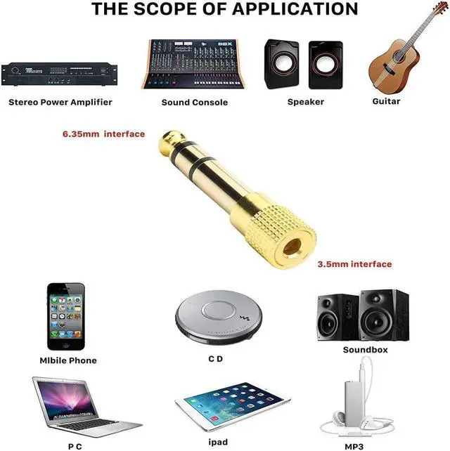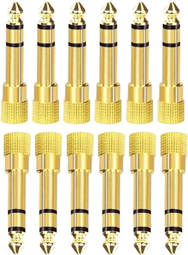 Connectors: Stereo 6.35 mm (1/4 inch) Male TRS to 3.5 mm (1/8 inch) Female TRSStereo headphone jack converter; Converting a 3.5 mm (1/8 inch) Female jack into a 6.35 mm (1/4 inch) male jack adapter. 24k gold plated connectors resist corrosion and reduce tarnish. 360 grip treads to easily plug and unplug in adapter. Provides excellent sound and high quality audio connection.