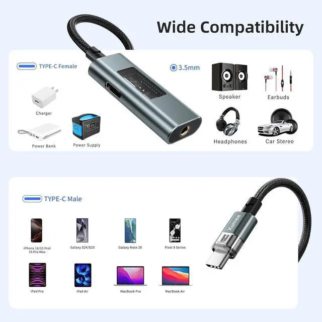Wide CompatibilityOur 3.5 mm to USB C adapter is compatible with iPhone 16 / 16 Pro / 16 Plus / 16 Pro Max / 15 / 15 Plus / 15 Pro / 15 Pro Max. Compatible with iPad Pro / Mini 6 / Air 4. Compatible with Galaxy S25 / S24 / S24 Plus / S24 Ultra / S23 / S22 / Z Fold / Z Flip Pixel 8 Pixel 7 for Macbook Pro / Air Laptops with USB-C Port and more USB-C devices.