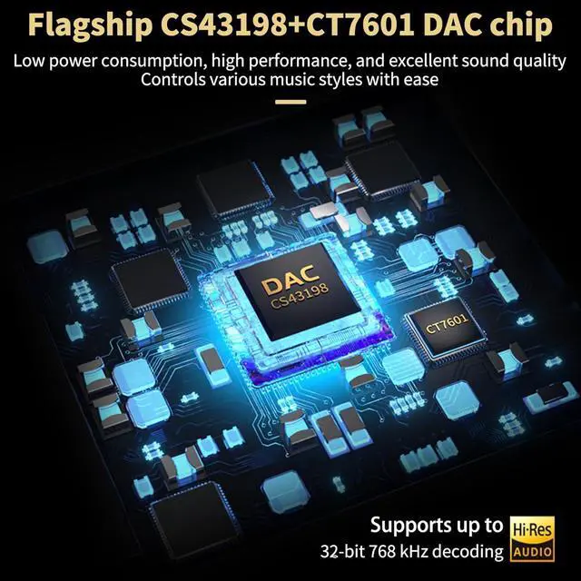 NoteUAC 1.0 ModeActivate by holding power button during startup (cannot switch mid-use). [2025 Upgraded Version]This new-generation USB-C portable headphone DAC and amplifier supports up to DSD256 and PCM 32-bit/768 kHz decoding delivering high-resolution sound reproduction. With a powerful drive of up to 60mW@16/55mW@32 it effortlessly powers both high- and low-impedance headphones via 3.5 mm single-ended balanced connections immersing you in an exquisite musical experience. [Flagship Chip] The Daakro portable headphone amplifier is equipped with Cirrus Logic's CS43198 and CT7601 DAC chips which deliver exceptional system-level audio performance without draining mobile devices' batteries. With an ultra-low noise floor of 1V total harmonic distortion (THD) of 0.0001 % a signal-to-noise ratio (SNR) of up to 132dB and an ultra-wide adaptive impedance range of 16-600 you can enjoy pure crystal-clear sound quality.