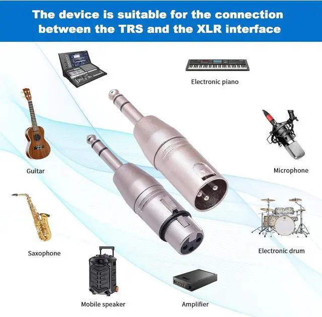4 Pack Balanced 1/4-inch TRS to XLR adapterconverts a 1/4-inch input into an XLR male output and 1/4-inch input into an XLR female inputPlug and Play - This adapter does not require special tools or complex settings. Connect cable and device in a convenient and economical manner. The international standard of audio connectors reliable transmission of audio frequencies all-metal construction ensure loss-less transmission signal. Protective Shielding for RF and EMI noise elimination. Another one of those adapters that every audio geek needs to have in their toolbox. XLR Adapters for Pro Audio use. Great for mixers microphones amplifiers EQ rack gear keyboards guitars electric piano electric drums etc.