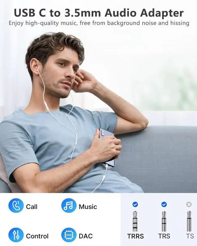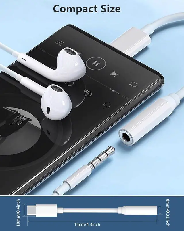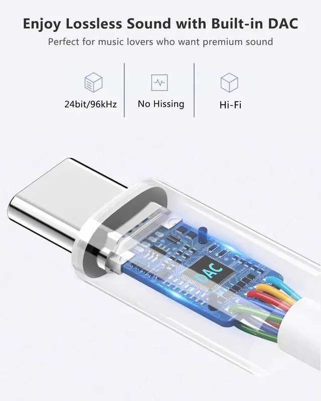 Note: EarPods do not support the volume adjustment function. Hi-Fi Sound QualityBuilt-in noise reduction technologyWith a sampling rate of 96 000 times per second this compact USB-C to 3.5 mm headphone adapter captures every musical detail. Equipped with an intelligent DAC chip the dongle accurately reproduces deep bass crisp highs and balanced mids enhancing your music experience to new heights. Featuring built-in Clear Voice Reduction (CVR) technology this usb c to Aux adapter effectively filters out ambient noise delivering crystal-clear immersive call quality. Wide CompatibilityThis USBC to headphone adapter is compatible with most