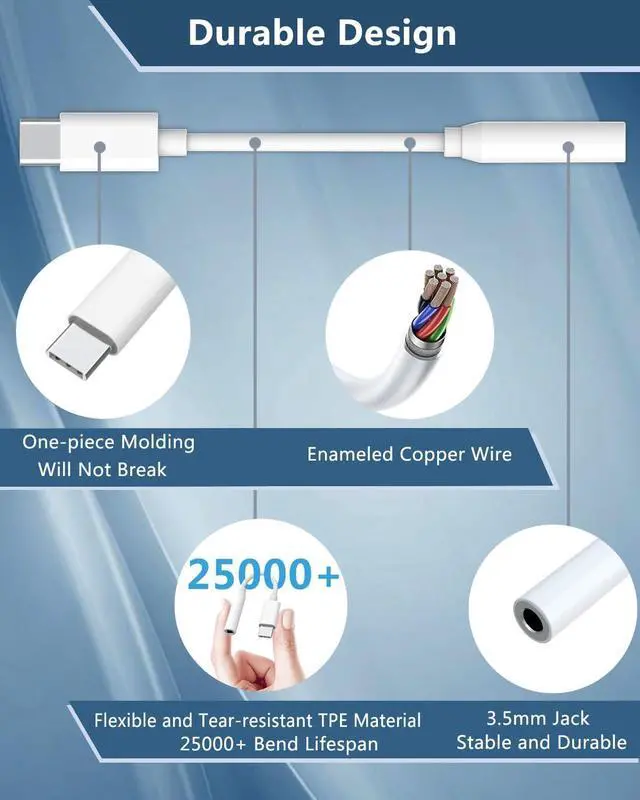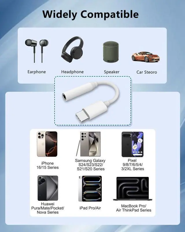 USB-C devices: iPhone 16/16E/16 Plus/16 Pro/16 Pro Max 15/15 Plus/15 Pro/15 Pro Max i Pad Pro i Pad Air i Pad Mini 6 MacBook; Galaxy S25/S24/S23/S22/S21/S20 Plus Ultra Z Fold 6/5/4/3 Z Flip 6/5/4/3 Note 20/10/10 Plus A35/A54/A60/80/8S Galaxy Tab S9/S9+/S9 Ultra; Google Pixel 9/8/7/6/5/4 Pro XL; Surface Pro 9 / Surface Go 4; Mate 60/50/40/30/20/10 and Pro P60/P50/P40/P30/P20 and Pro; OnePlus 5/6/7/8/9 Pro; Motorola Edge30/40 and more USB-C smartphones and tablets. Plug and Play DongleNo need to install software or driversplug and play. This type c to audio jack adapter delivers smooth zero-delay soundno drivers or apps required. It's also headphone-friendly enabling you to answer phone calls pause playback and control volume directly from your headphones. Engineered for Reliability This USB C to Aux Adapter combines a seamless one-piece design with durable ABS housing and flexible TPE material rigorously tested to withstand over 25 000 bends while remaining tangle-resistant. Its pure oxygen-free copper core guarantees stable uninterrupted signal clarity for dependable performance. You will receive a 2-Pack USB type c to 3.5 mm Female audio Adapter. Please feel free to contact us we will respond to you within 24 hours.