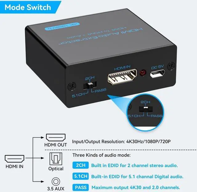 (Note: Devices do not support ARC and eARC. TV is not supported as the input sourceotherwise product doesn't p video. )3 modes 2.0CH 5.1CH and PASS mode. Select 3.5 mm stereo output please use 2.0CH mode. Select optical output please use 5.1CH mode. When you use the first and two modes and find that no audio and video signal is output use the pass mode. 4K Ultra-HD with HDMI 1.4VHDMI audio converter up to 10.2G bandwidth support HDCP 1.4 4K@30Hz RGB /