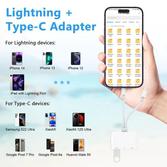 Universal CompatibilityThe lightning port compatible with iPhone 14/13/13 Mini/13 Pro/13 Pro Max/12/12 Mini/12 Pro/12 Pro Max/11/11 Pro/11 Pro Max/SE 2020/XS/XS Max/XR/X/8/8 Plus/7/7 Plus/6;The Type-C port compatible with most type-c interface phones,iPad Pro,laptops and players,USB- Phones and tablets with C interface.