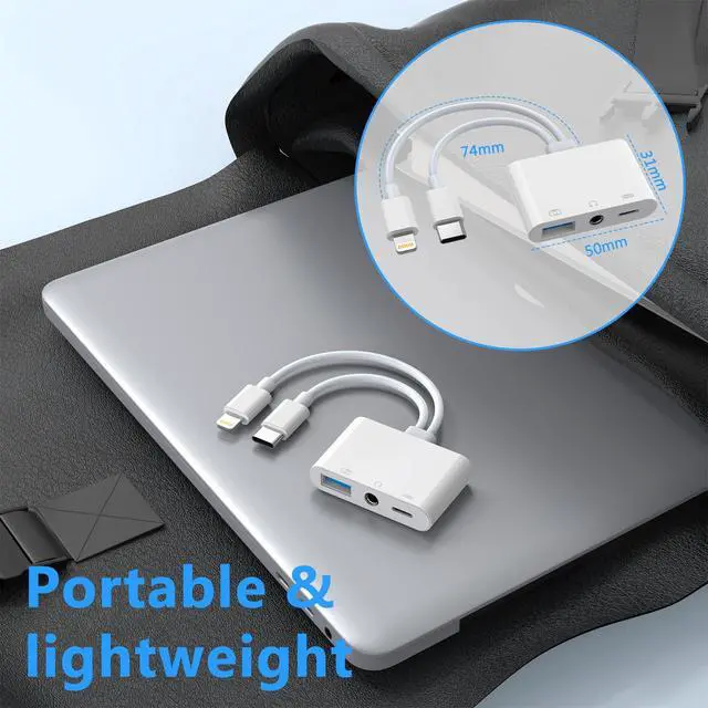 Design for iPhone/Most Type-C PhonesThis Lightning/USB C to USB adapter comes with USB OTG port,3.5mm headphone jack and fast charging port,supports multiple ports to work at the same time,Type-C supports calling,listening to songs Or transfer files and charge the device,you can quickly charge your device at any time without worrying about low battery power,saving you more time.Note:Lightning to 3.5mm Audio not supports calling.Plug & Play, no app needed.