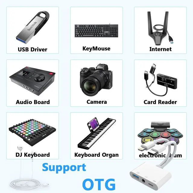 Multifunctional OTG AdapterThis lightning/USB C to USB adapter supports transferring files to USB-C devices (such as Excel,Word,Txt,PDF,MP3,MP4,JPEG,RAW,etc.) at a transfer speed of 480 Mbps / 5G bps,It also supports connecting USB peripherals,such as U disk,U disk,USB hub,USB microphone,USB camera,electric piano,keyboard,mouse,music keyboard PAD,speakers,etc.