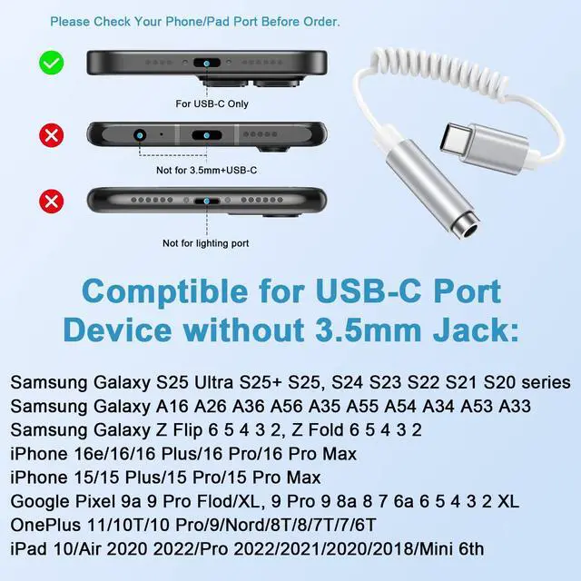 45cm Short Coiled USB C to 3.5mm Headphone Jack Adapter is designed for users of iPhone models 16e, 16, 15 series,