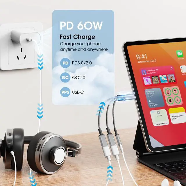 PD 60W Super-Fast Charging The Type C audio and charger supports 60W PD charging with a built-in powerful charging chip. It satisfies the PD, QC, AFC, and PPS fast charging standards making it appropriate for fast charging of most devices. The charging dongle cable identifies and satisfies the voltage and current required by different devices, ensuring stability and security to protect your devices. Note: Please make sure that the charger plug and charging cable you use also support the PD fast charging protocol