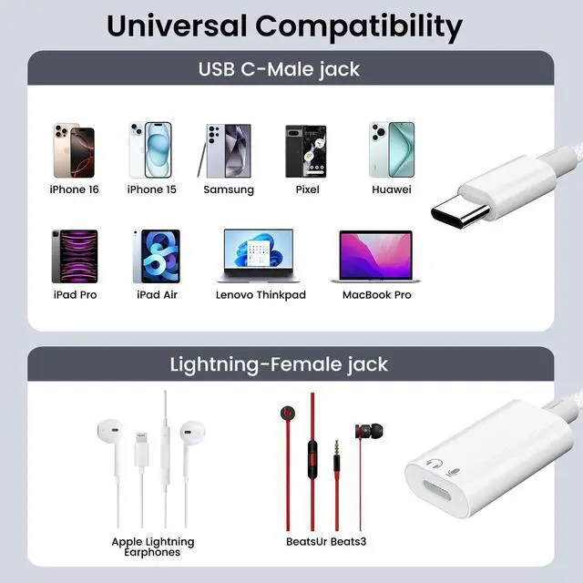 Wide Compatibility: Compatible with most of USB C devices such as iPhone 17/17 Pro/17 Pro Max/16/16 Pro/16 Plus/16 Pro Max/16e/15/15 Pro/15 Plus/15 Pro Max, iPad Pro 2018/2022, iPad Air 6/5/4, iPad Mini 6, iPad 10, MacBook iMac. Samsung Galaxy S25/S24/S23/S23 Ultra/S22/S21/S21FE/S20FE, Google Pixel 8/7/7Pro/6Pro/5. NOTICE: This is an Audio Adapter, Not a Charging Adapter