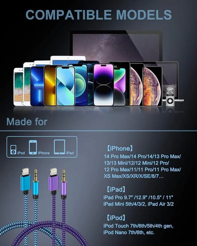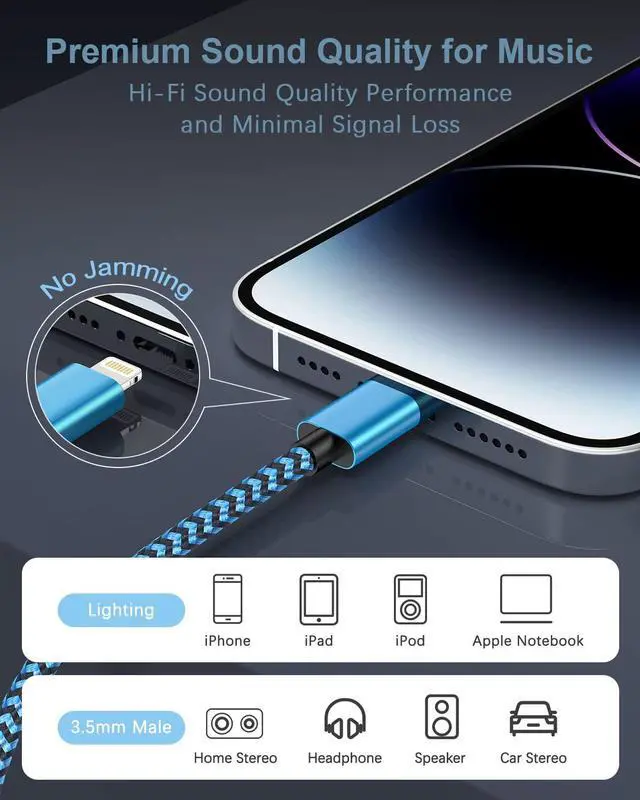 The lightning to 3.5mm cable is made of premium enhanced connector, gold-plated 3.5mm conductor and durable braided nylon material, makes the lighting aux cord to be strong but flexible, durable to use.