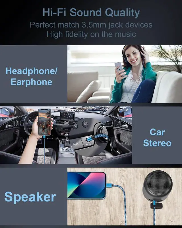Lightning to 3.5mm Aux Audio Cord is designed for iPhone and can be used to connect to car/home stereos, speakers, headphones, Hi-Fi, or anything else with a 3.5mm input jack.